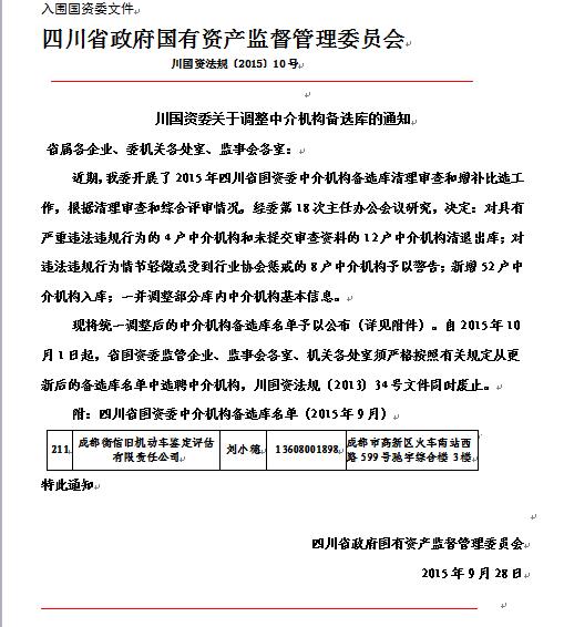在此,我公司明確提醒有此類(lèi)評估需求的單位或個(gè)人。我公司才是一直入圍四川省政府國有資產(chǎn)監督管理委員會(huì )的國資委備選庫內備選單位(后附證明材料)。如果貴單位在尋找諸如此類(lèi)的評估時(shí),請一定注意審查你所咨詢(xún)的公司是否真正入圍《川國資委關(guān)于調整中介機構備選庫的通知》。不要一味的依據報價(jià)來(lái)衡量一個(gè)專(zhuān)業(yè)評估公司的道德素養。